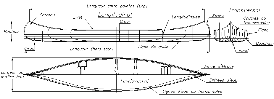 de la carène d'un canoë. On y retrouve toujours une vue de profil, avec des coupes de
